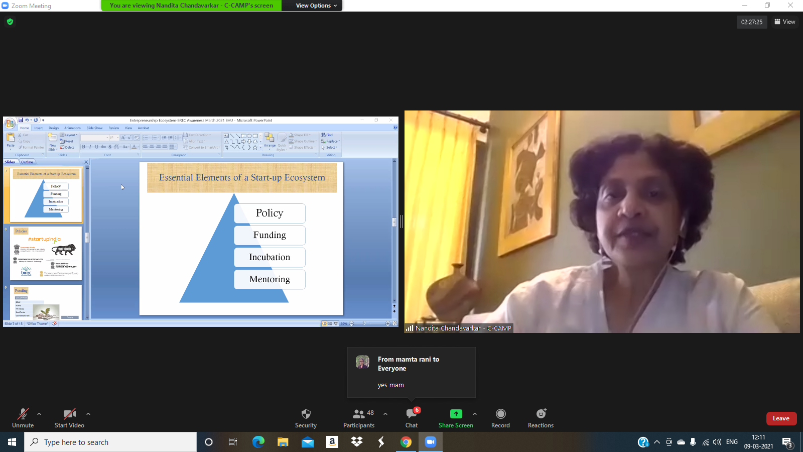 C-CAMP Bengaluru and BioNEST BHU jointly organised an Entrepreneurship Awareness Program on 9th March 2021. About 70 college students from BHU Varanasi & other colleges and Universities around Varanasi took part in the programme. Welcome address given by Prof. Anil Kumar Tripathi, Coordinator, BioNEST & Director, Institute of Science, BHU followed by Introductory Remarks by Dr. Taslimarif Saiyed, CEO & Director, C-CAMP. Mr. Sunil Chari MD and Co-founder, Rossari Biotech and Dr. Suphiya Khan, Associate Professor and Founder at Drumlins Water Technologies  shared their experience and journey as an entrepreneur with the participants. These two sessions were very interesting and motivated all students. Mr. Shivkumar, Partner, K & S Partners discussed Intellectual Property Rights and How to file a patent. Ms. Nandita Chandavarkar, Consultant - Entrepreneurship & Head - C-SAP, C-CAMP elaborately shared various funding schemes available for the start ups.