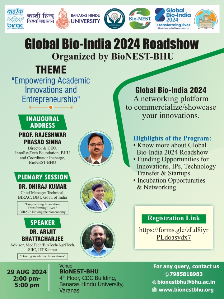BioNEST-BHU is organizing the Global Bio India 2024 Roadshow on the 29th of August, 2024, from 2:00 PM to 5:00 PM. The theme for the event is “Empowering Academic Innovations and Entrepreneurship” aimed at inspiring faculty members and students to pursue Innovations and Entrepreneurship.