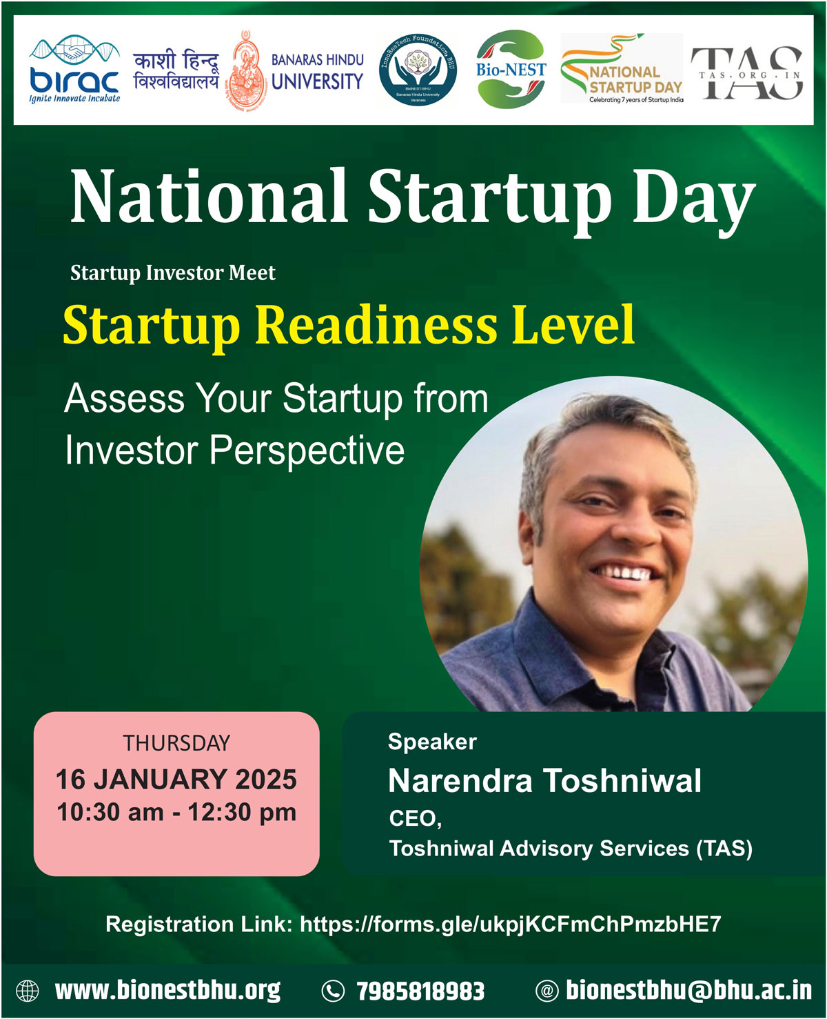 As part of the National Startup Day celebrations, BioNEST-BHU is pleased to invite you to participate in an insightful webinar on "Startup Readiness Level" on January 16, 2025, between 10:30 AM to 12:30 PM.