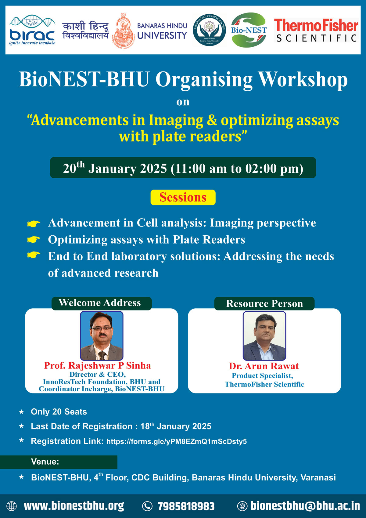Exciting news! BioNEST-BHU, the bio-incubation center located on the 4th floor in the CDC building, BHU is organizing a workshop titled "Advancements in Imaging & optimizing assays with plate readers" on January 20, 2025, between 11 AM to 02 PM.
